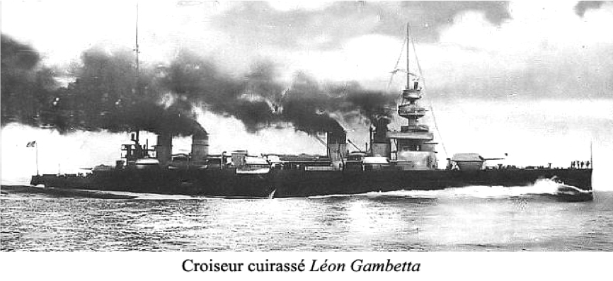 Le 27 avril 1915 à 0h40, le croiseur cuirassé LEON GAMBETTA, commandé par le capitaine de vaisseau ANDRE avec à son bord le contre-amiral SENES, est torpillé par 2 fois par le sous-marin Autrichien U5 du lieutenant de vaisseau VAN TRAPP dans le canal d’OTRANTE au large de SANTA MARIA DE LEUCA.